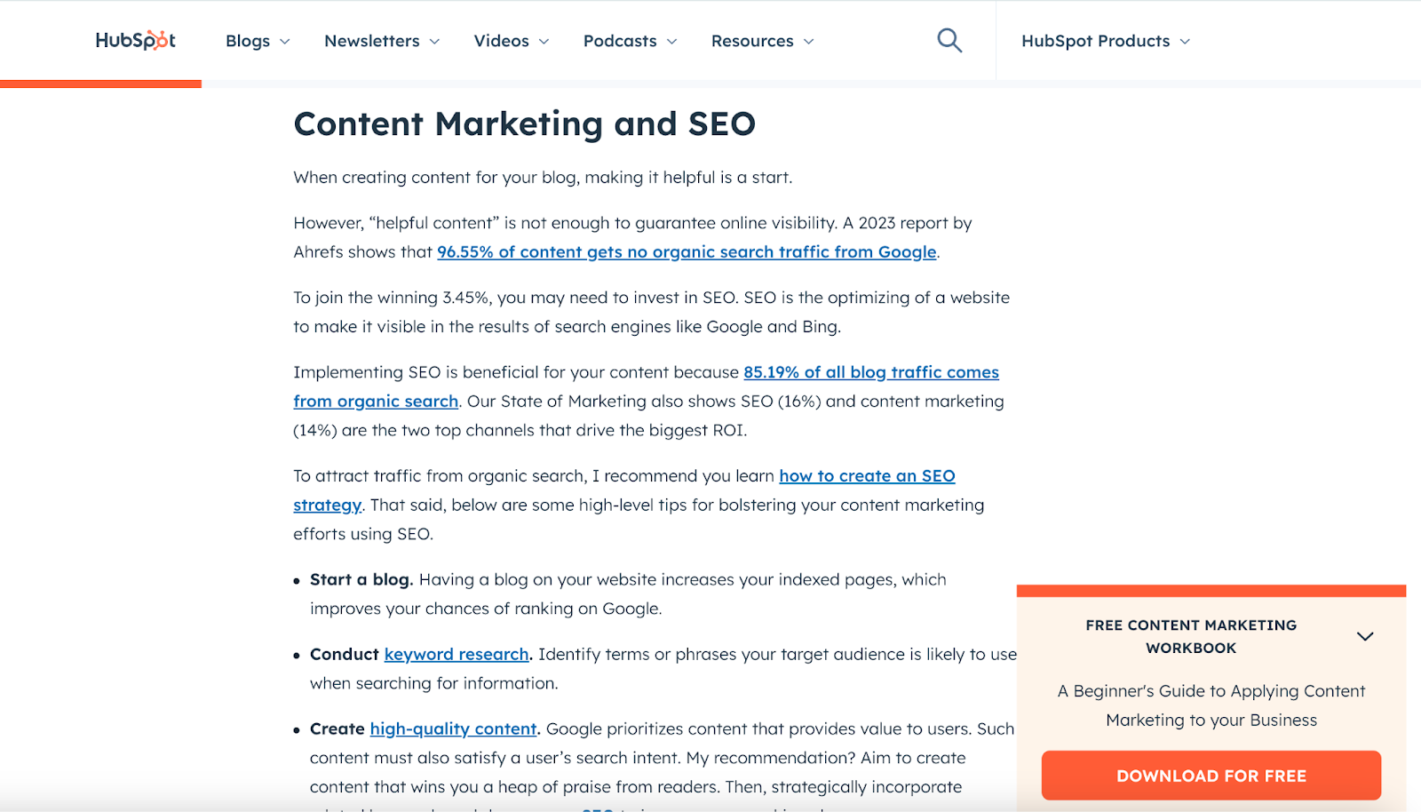 For instance, on their newbie’s content material advertising information, they’ve a CTA within the nook pitching their free content material advertising workbook: