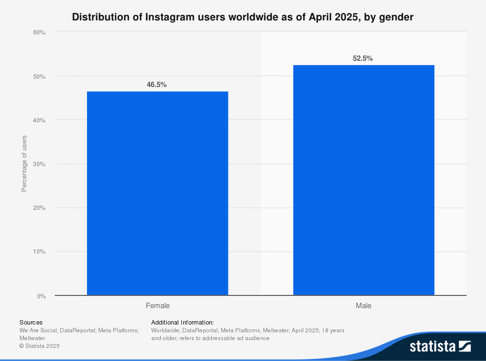 Globally, Instagram’s gender distribution in 2025 is 52.5% male and 46.5% feminine — a close to stability. In some areas, just like the U.S., ladies truly edge forward in utilization. And whereas Meta’s information nonetheless experiences solely binary gender classes, the development is evident: Instagram is not skewed to at least one facet.