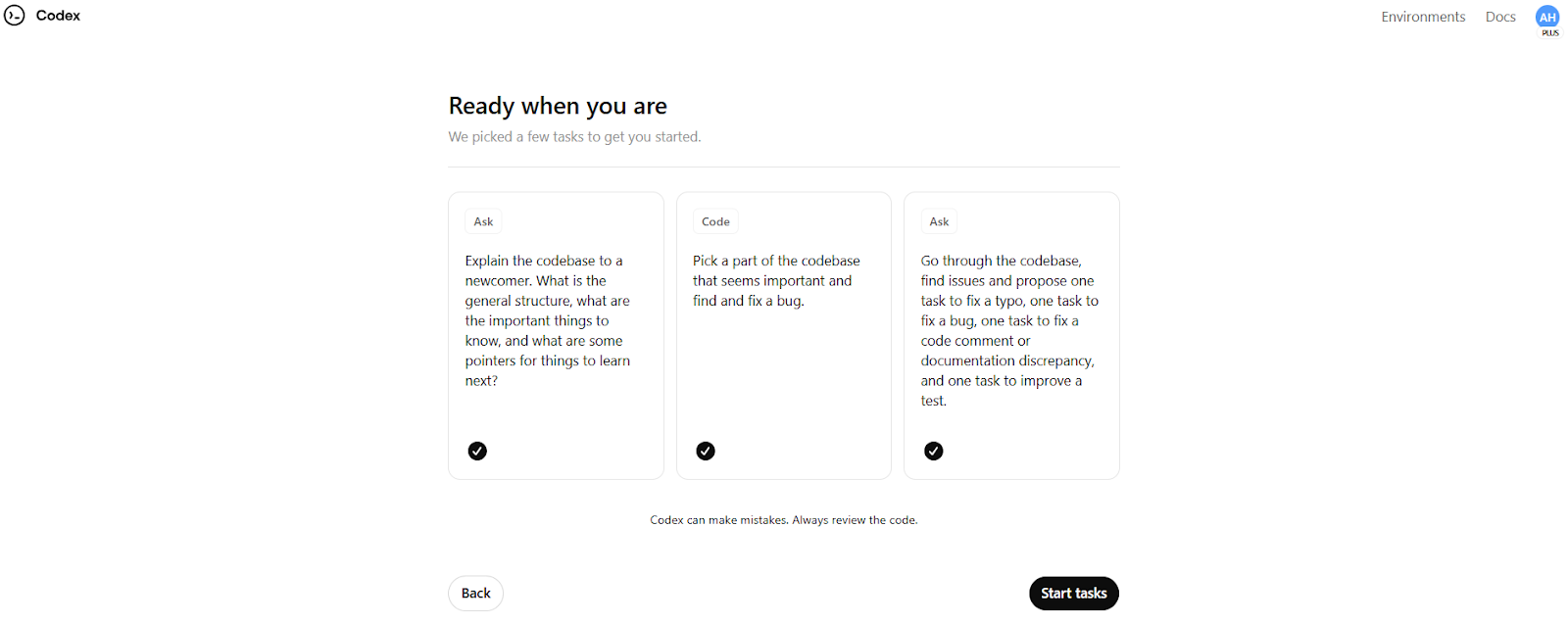 Codex suggests a list of tasks that we can do once our repository and features are ready. Codex suggests that we explain the code structure and identify and fix bugs. We also check for small issues like typos and broken tests. It’s wonderful that Codex can help us break the ice, even if the project is unfamiliar to us. The cards are bite-size onboarding exercises that help us quickly learn and understand the codebase, while also seeing Codex at work. The assistant is ready to start analyzing the code and work with us once we have checked off all three.
