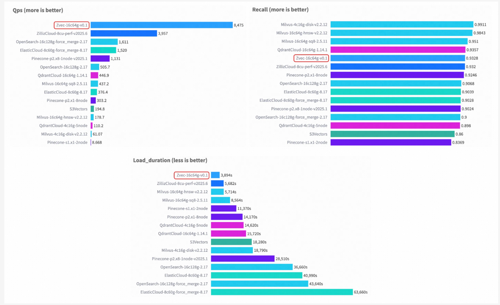 - Zvec delivers >8,000 QPS on VectorDBBench with the Cohere 10M dataset, achieving more than 2× the previous leaderboard #1 (ZillizCloud) while also reducing index build time.