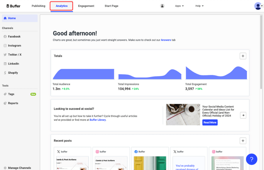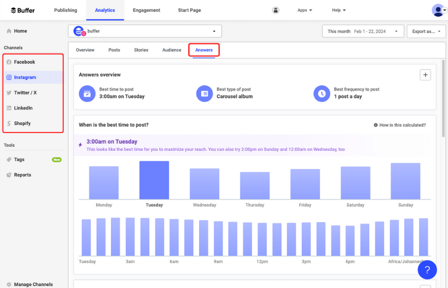 Buffer Analytics is offered in our paid plans for Fb, Instagram, Twitter/X, and LinkedIn Pages. Our Solutions function can suggest the most effective days and occasions for Instagram posts and the most effective days to publish for Fb, Twitter/X, and LinkedIn Pages.