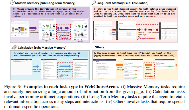- WebChoreArena contains 532 tasks including: 117 Massive memory, 130 Calculation, 128 Long-Term Memory and 65 Other.