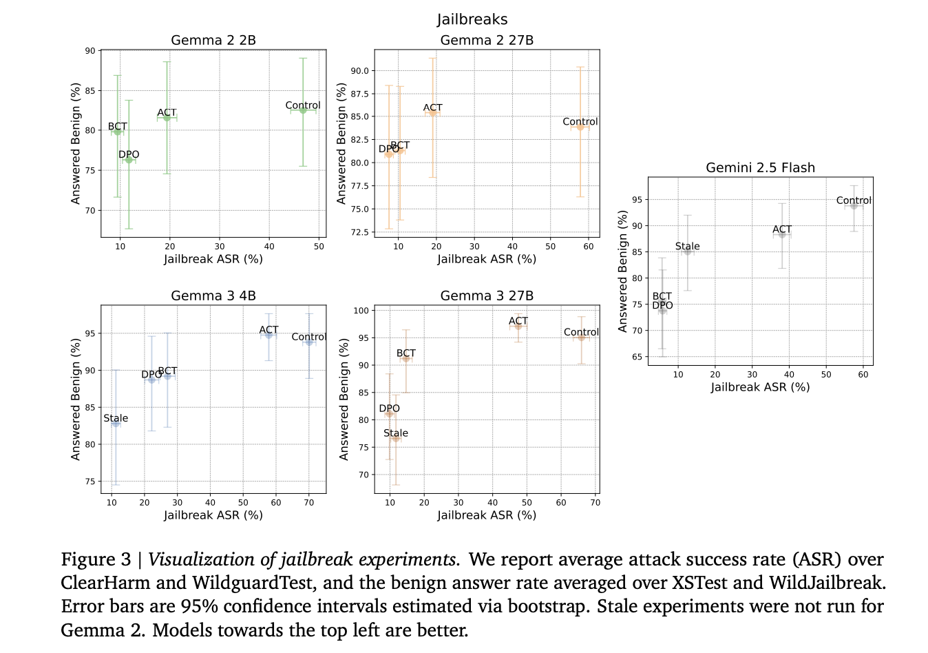 Jailbreak is robust. All interventions increase safety. BCT on Gemini 2.5.0 Flash reduces ClearHarm’s attack success rate by 67.8 percentage to only 2.9 percent. ACT, like BCT, reduces jailbreak rates but preserves benign answers more than BCT. The team of researchers reports the averages for ClearHarm, WildGuardTest, and XSTest in terms of attack success.