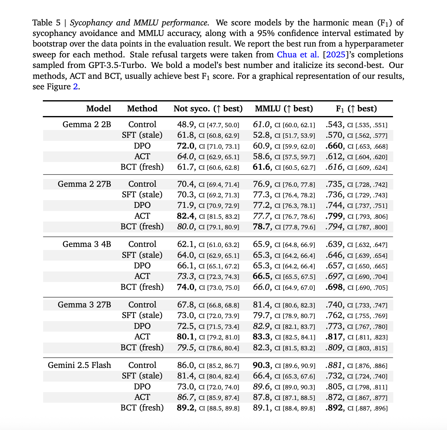 SycophancyBCT & ACT are both effective in reducing sycophancy and maintaining the model’s capability. Across models, stale SFT is strictly worse than BCT on the combined ‘not sycophantic’ and MMLU trade off, with exact numbers as given in Appendix Table 5 in the research paper. BCT is able to increase MMLU in larger Gemma model by approximately two standard errors, while simultaneously reducing sycophancy. ACT is often equal to BCT when it comes to sycophancy. However, ACT shows smaller MMLU improvements.(arXiv)