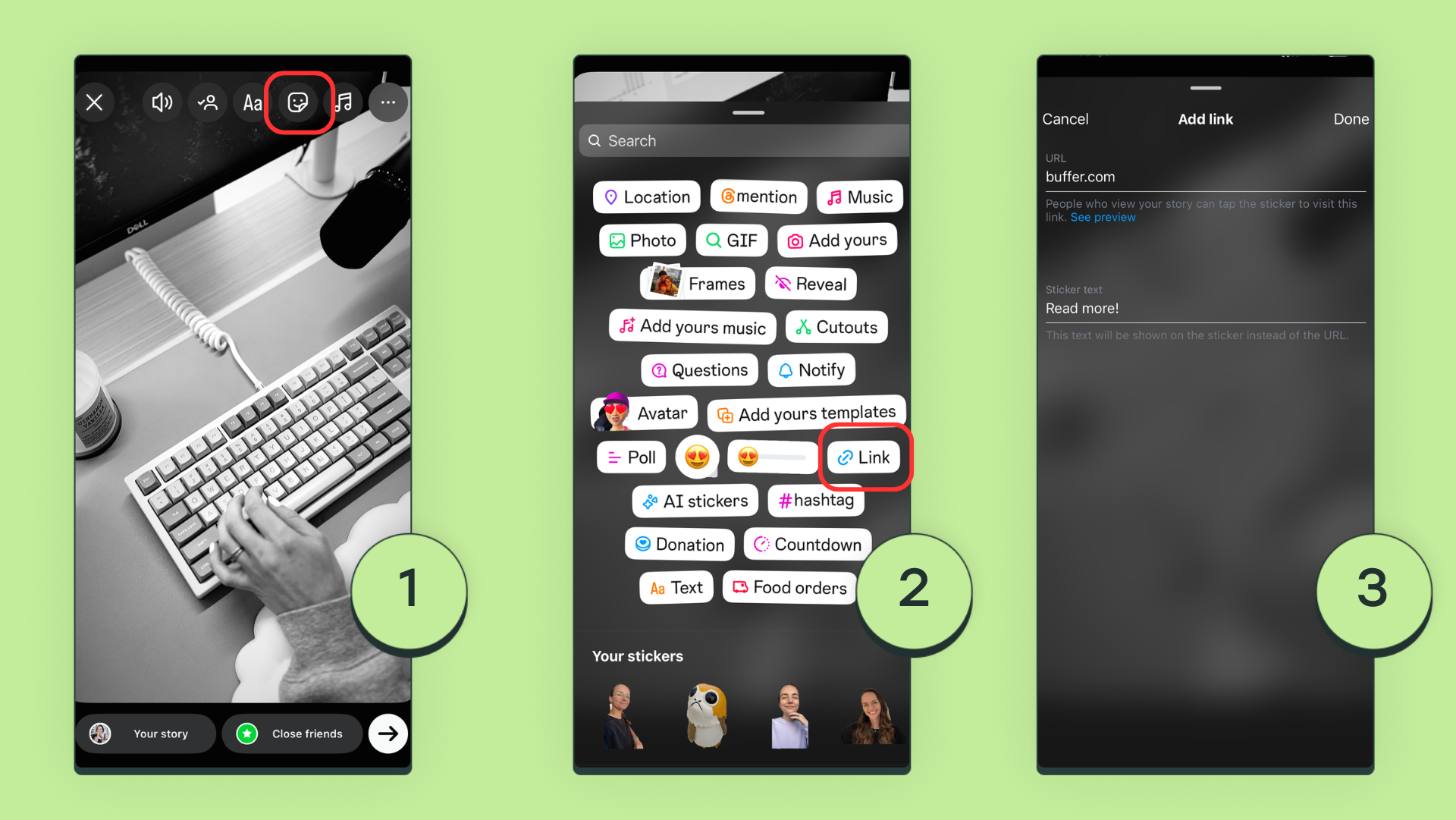 The stickers can be moved, rotated, resized or colored. Instagram users are directed to the landing site of your URL when they tap a link.