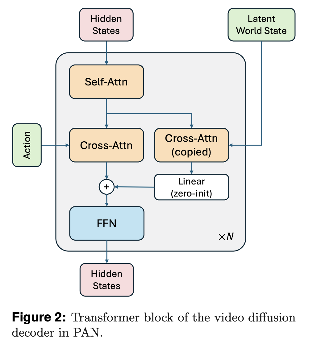 In PAN, the vision encoder and backbone are built on Qwen2.5-VL-7B-Instruct. The vision tower tokenizes the frames and creates structured embeddings. The language core runs over the history of actions and world states plus the learned query tones and produces the latent image of the next global state. They are located in the VLM’s shared multimodal environment, where they help ground dynamics both in text and in vision.