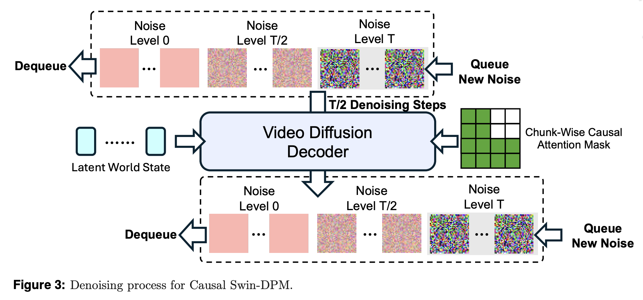 - This DPM system uses the Causal Swin mechanism, which is a sliding frame, chunk by chunk causal denoising technique that works on previously noised chunks. The resultant video can be rolled out with longer horizons while reducing temporal drift.