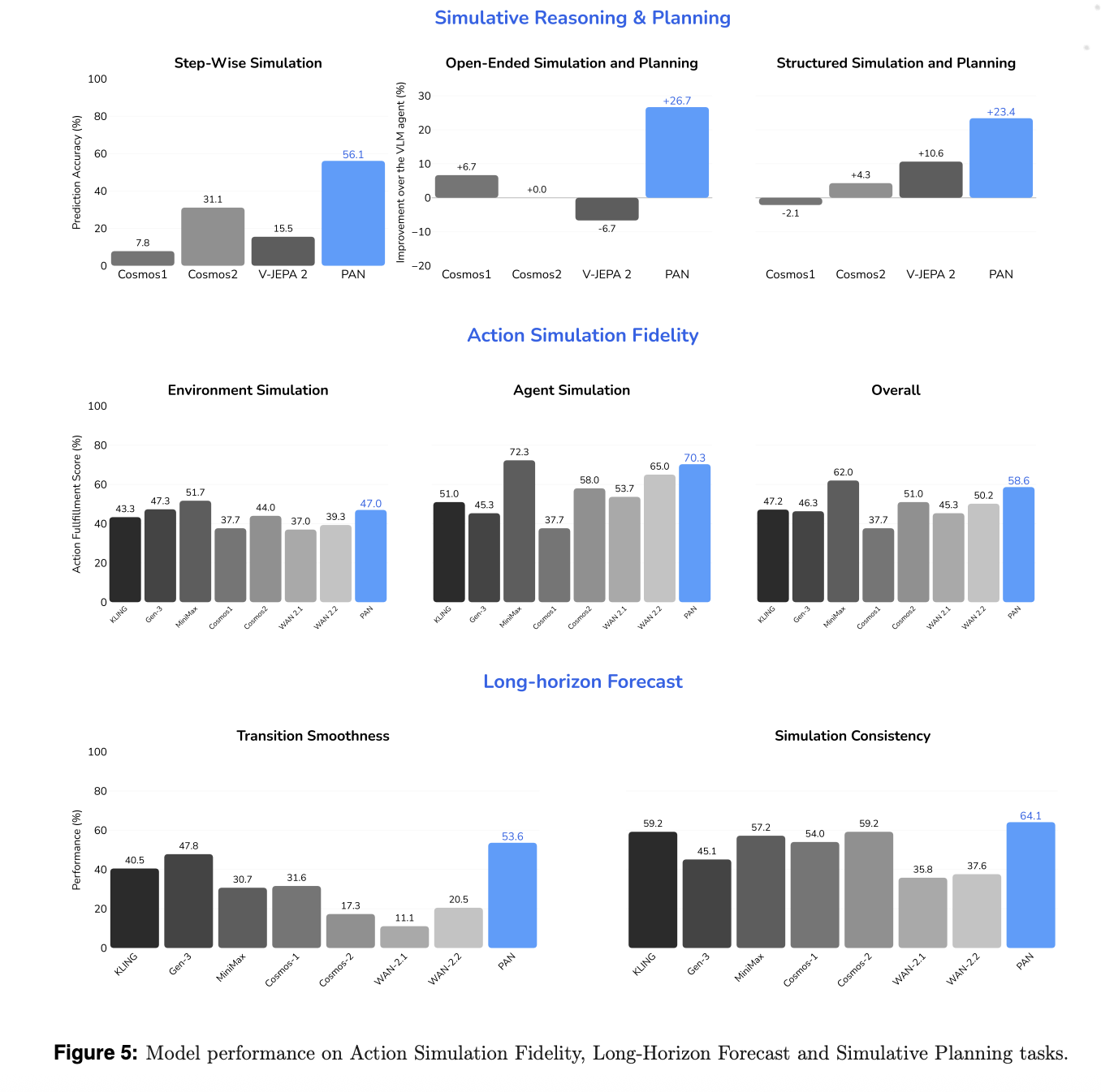 - PAN achieved state-of-the art results in open source on action simulation fidelity and long horizon planning. Scores such as 70.3% for agent simulation, 48.7% for environment simulation, 53.6 % transition smoothness and 64.1% consistency were reported, all while being competitive with commercial systems.