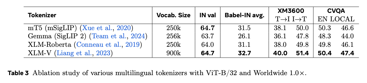 Meta Clip 2 outperforms its English-only (1.0×) and non-English (1.3×) counterparts in both English and multilingual tasks when trained on ViT-H/14 with worldwide data and scaled seen pairs. In non-scaled models or smaller ones like the ViT L/14, however, this curse continues. The transition to international metadata from English is crucial. As an example, by removing the English filters from alt-texts, ImageNet accuracy drops 0.6%, underlining the importance of isolation. The initial performance of English is reduced when replacing English metadata by merged global metadata. However, this improves the multilingual capability. When evaluating zero-shot classification benchmarks and geo-localization benchmarks, it is evident that scaling the number of English-to-worldwide pairs from 13B to 29B improves performance except in GeoDE.