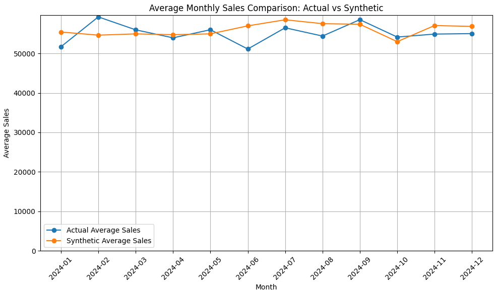 We can observe that the distribution of the ‘Sales’ column in the real and synthetic data is very similar. To explore further, we can use matplotlib to create more detailed comparisons—such as visualizing the average monthly sales trends across both datasets.